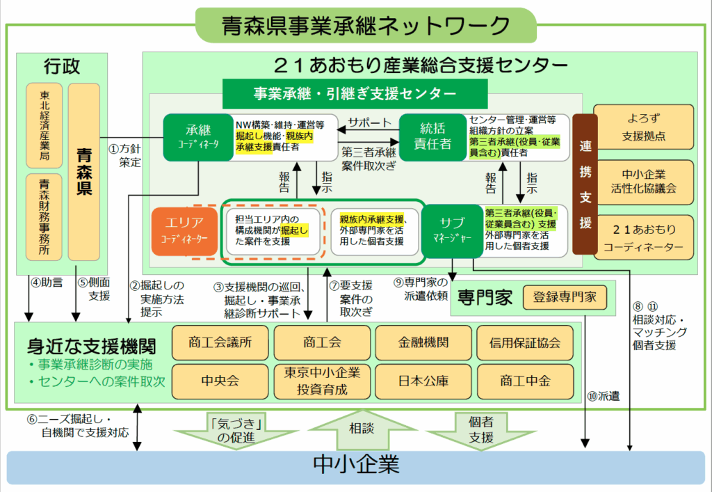 | 公益財団法人21あおもり産業総合支援センター (よろず支援拠点、事業承継・引継ぎ支援センター、中小企業活性化協議会含む) | ・ネットワークの事務局機能